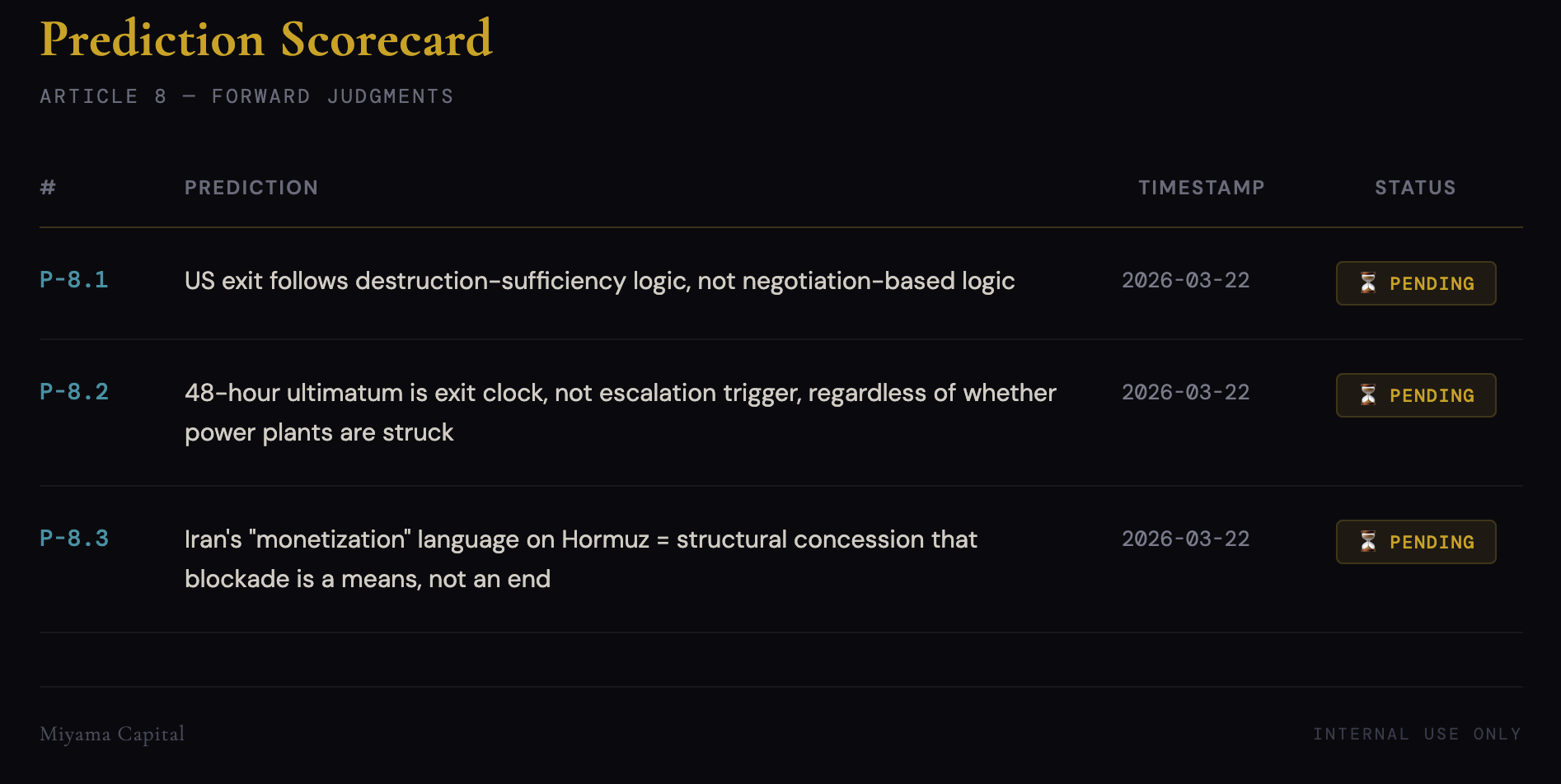 4. The 48 hours expire with neither a strike nor any winding-down follow-through. If Trump lets the deadline pass without acting on the ultimatum and without advancing the exit narrative, the timeline assumption underlying this framework needs to be extended. The directional thesis (exit) may still hold, but the speed variable changes materially. This is the softest invalidation: it does not break the framework, but it forces recalibration.