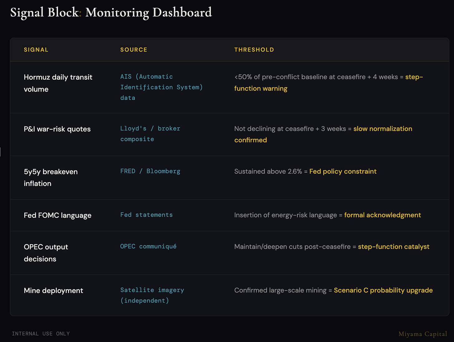 Watch List: Hormuz daily transit volume, P&I war-risk quotes, 5y5y breakeven inflation, Fed energy-risk language, OPEC output decisions, satellite confirmation of mine-laying activity.